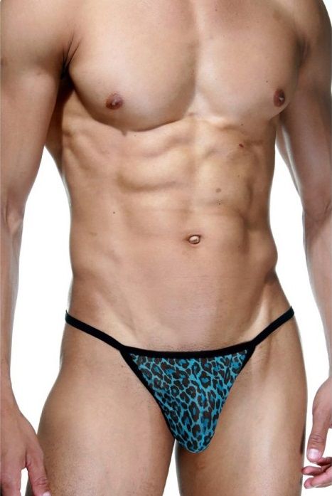 Мужские стринги, из двух видов ткани. Спереди - полупрозрачная тонкая мягкая ткань расцветки голубой леопард, а сзади - черное кружево.