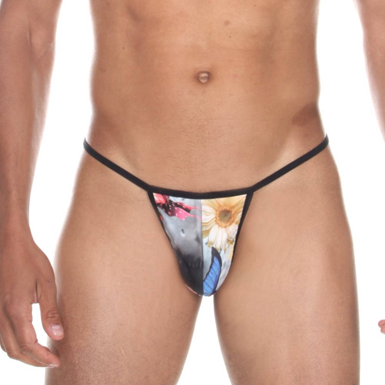 Темно-серые мужские трусы-стринги с принтом.