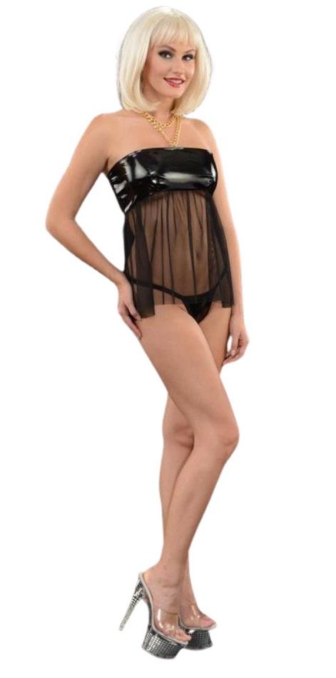 Стильный соблазнительный черный комплект из сорочки с блестящим гладким лифом. В комплекте трусики-стринги с золотой цепочкой сзади. В комплекте: сорочка, трусики-стринги.