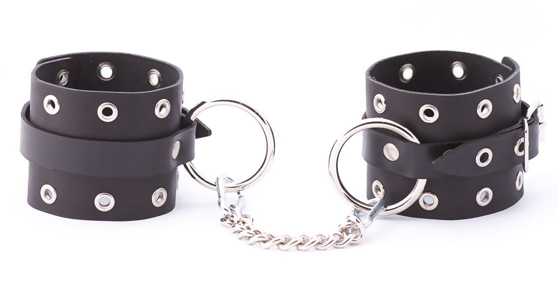 Кожаные однослойные оковы с люверсами. Оковы имеют кольца для крепления и металлическую сцепку. Ширина манжет - 6,5 см. Длина манжет - 25 см.
