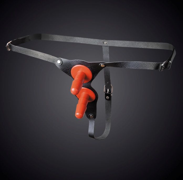 Страпон для двойного проникновения. В комплект входят два съёмных пластиковых плага для насадок. Изготовлен из натуральной кожи и никелированной фурнитуры. Размер универсальный.