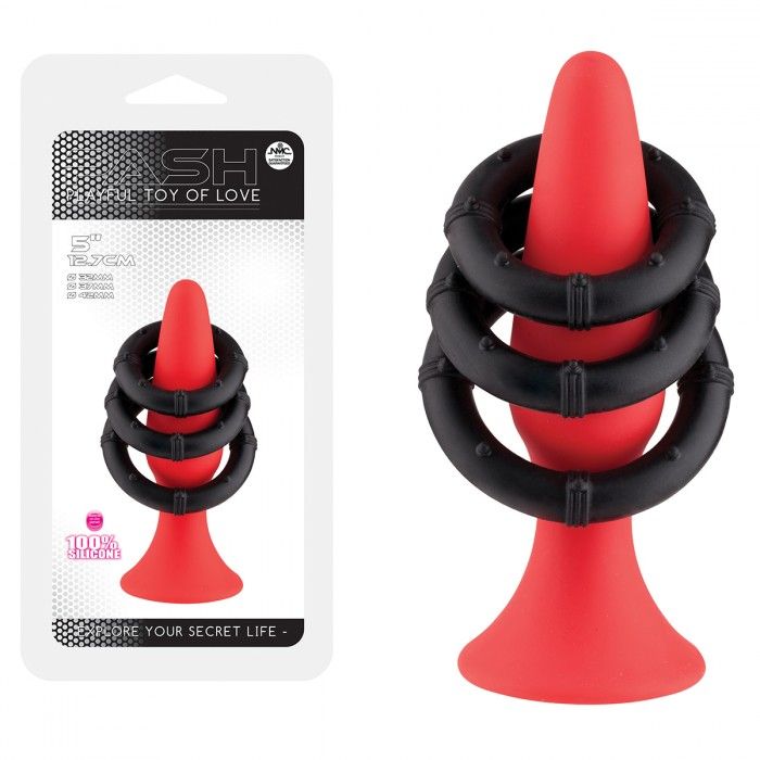 Красный плаг для анальной стимуляции из силикона. В наборе 3 черных силиконовых кольца, которые можно использовать на пенисе и мошонке. Диаметр колец - 3, 3,5 и 4 см. Рабочая длина пробки - 10 см., диаметр - 3 см.